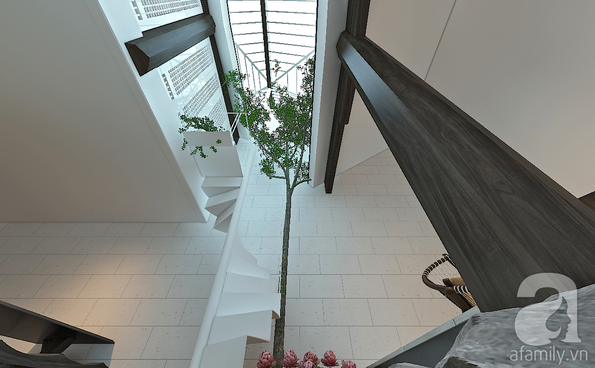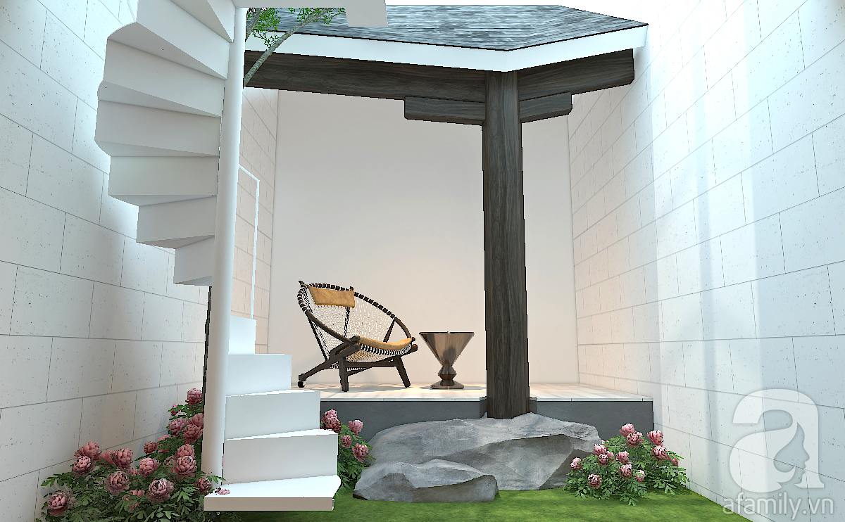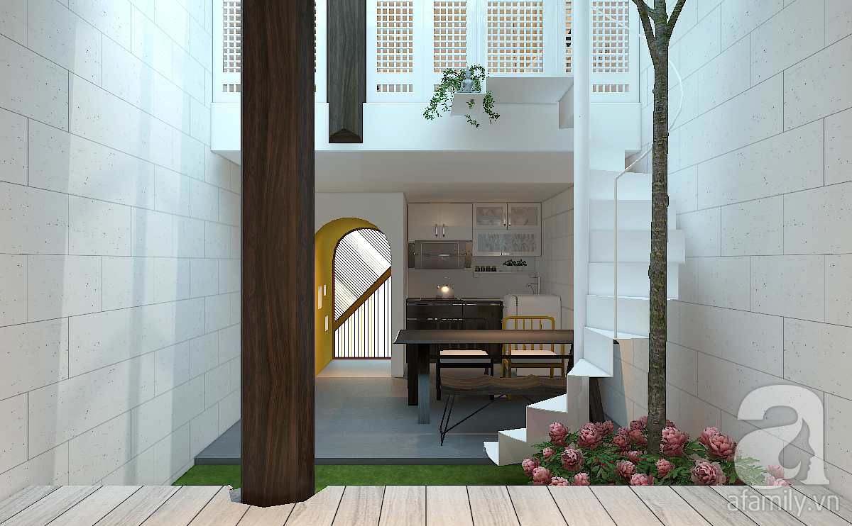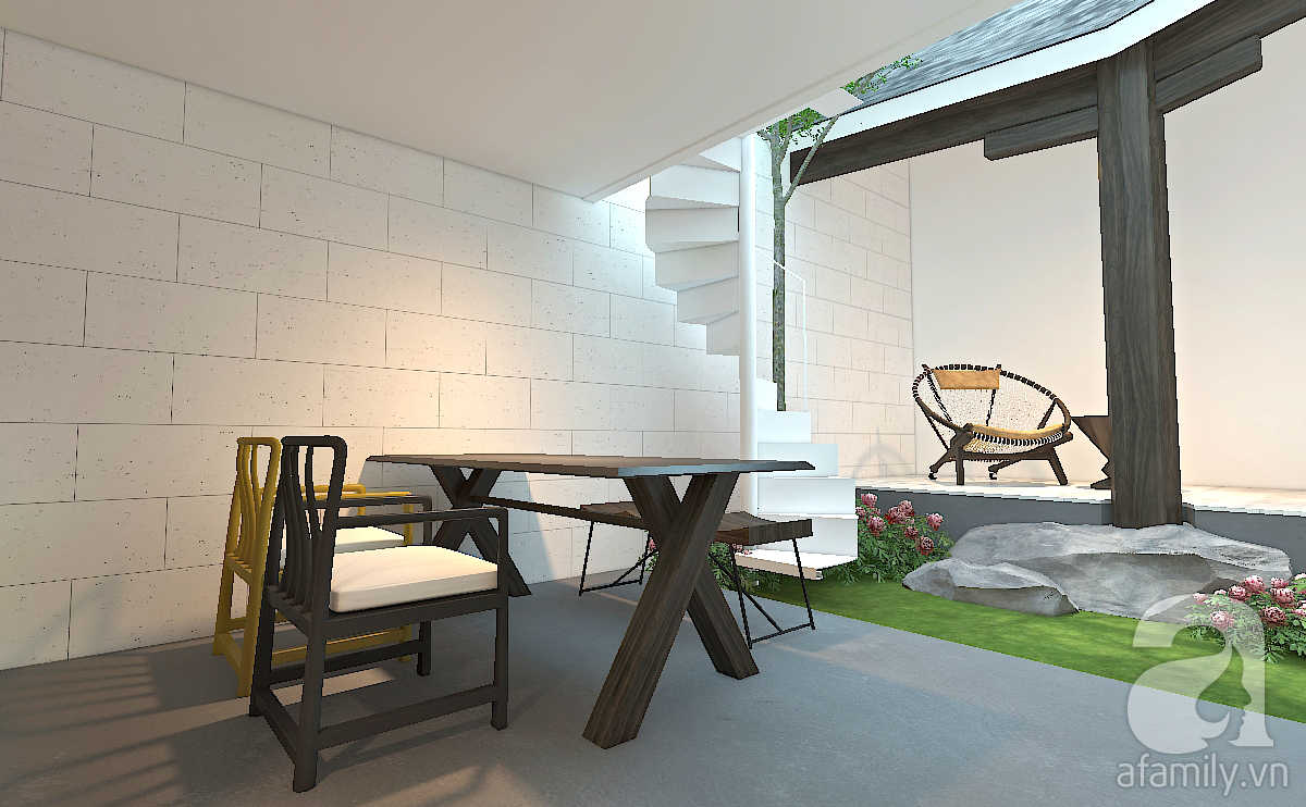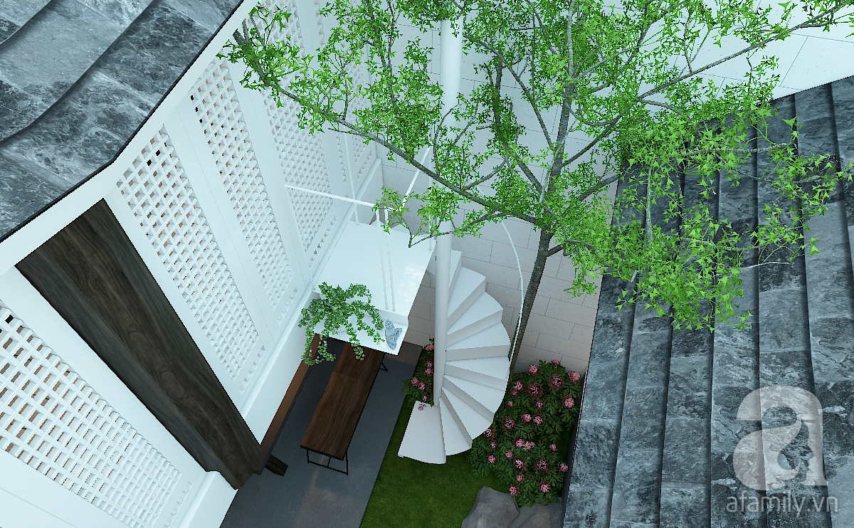Không gian cây xanh giữa nhà có thảm cỏ, bụi hoa và cây cao bóng cả che chắn trực tiếp cho cầu thang bộ lên tầng hai. Đây là một cầu thang bằng thép sơn trắng. Nhà không có trẻ em nên hiện tại cầu thang được thiết kế theo kiểu kiến trúc tối giản (minimalism).
