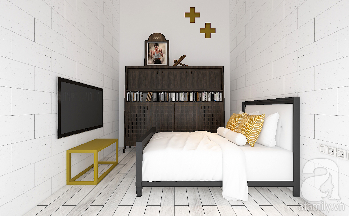 Gia chủ là cặp vợ chồng trẻ chưa có con nhỏ. Nên KTS đã làm phương án 1 phòng ngủ lớn và cao, để khi cần có thể tăng thêm phòng ngủ cho con nhỏ. Với một phòng ngủ có khối tích cao như thế này, khi cần gia tăng số người sử dụng ví dụ là có con. Chúng ta có thể thiết kế thêm 1 phòng ngủ ở trên cao kiểu gác lửng nhưng có chiều cao đảm bảo như 1 căn phòng bình thường. Hoặc cũng có thể làm một hệ giường tầng rộng rãi cho con nhỏ.
