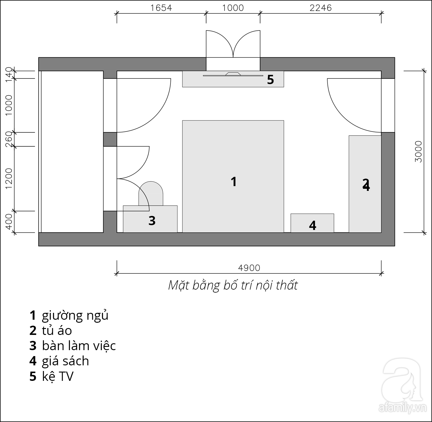 Em muốn xin tư vấn thiết kế lại phòng ngủ cho 2 vợ chồng trẻ. Phòng ngủ của chúng em có diện tích 3m x 4,9m và có rất nhiều cửa sổ, cửa ra vào. Hướng tây có 1 cửa sổ rộng 1,2m và 1 cửa ra ngoài ban công rộng 1m. Hướng Bắc là 1 cửa sổ 1m, hướng Đông 1 cửa ra vào 1m. Tất cả các cửa sổ, cửa ra vào đều là cửa gỗ và mở vào bên trong. Cửa sổ có 2 lớp 1 lớp cửa chớp mở bên ngoài và cửa gỗ kính mở vào bên trong nên phòng của chúng em khá chật.