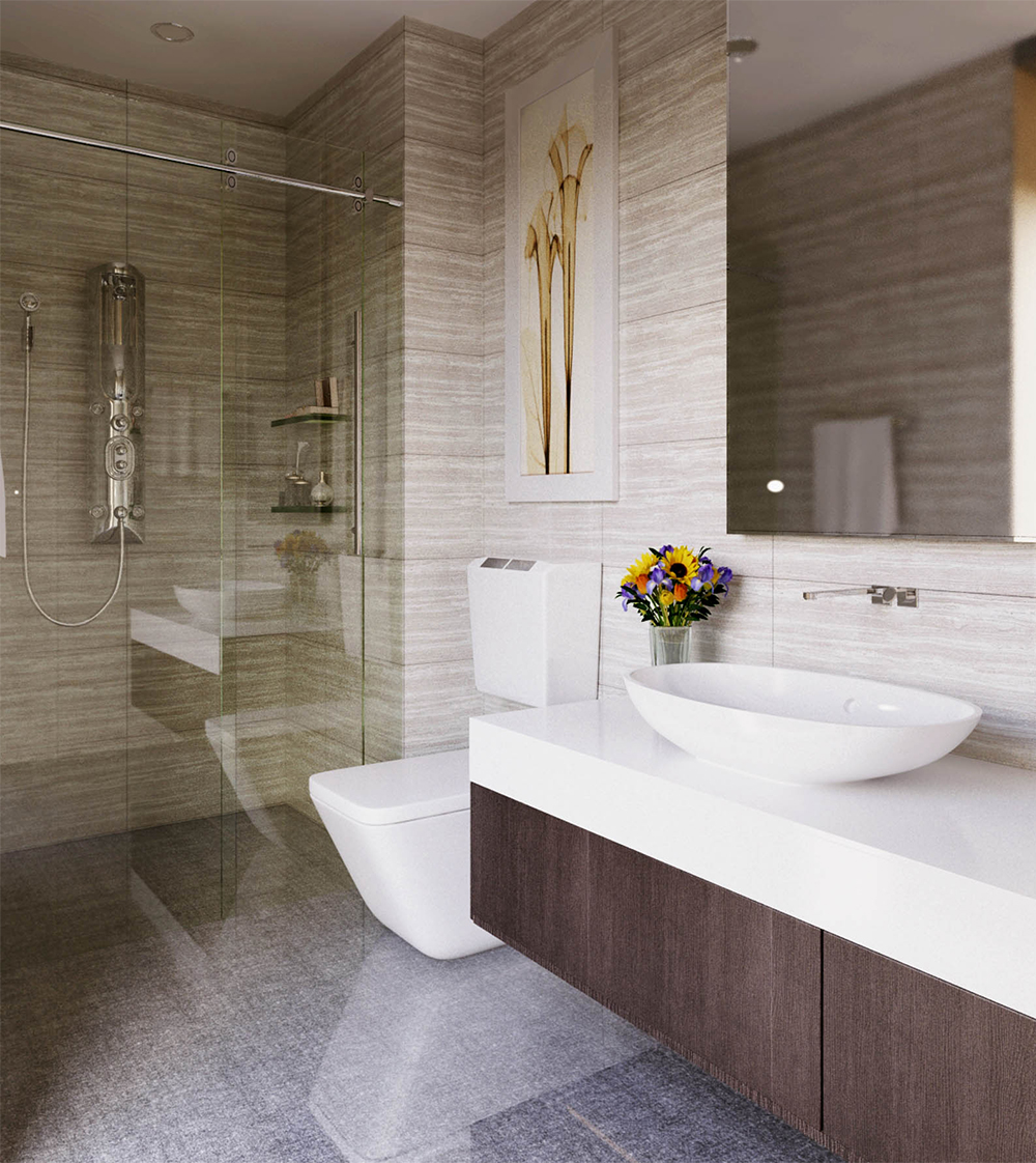 Đối với nhà vệ sinh, chúng tôi thấy hiện tại WC khá bé, vẫn có thể thiết kế được dạng Lavabo mặt đá, kích thước chiều ngang max750. Mình thiết kế vách tắm kính cho WC trong phòng master.