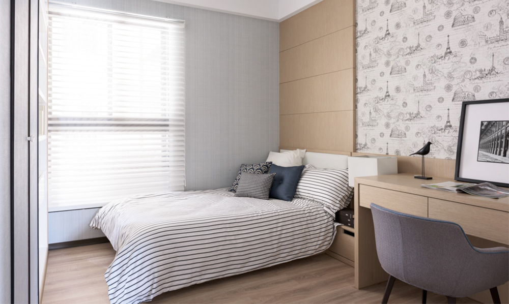 Phòng ngủ con với tone màu nhã nhặn lịch sự.