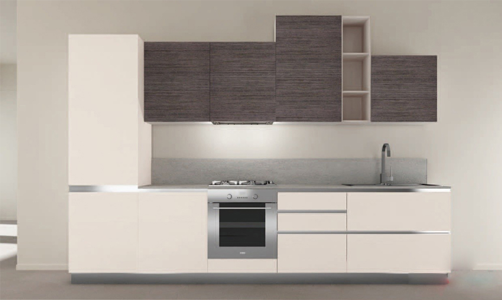Hệ tủ bếp chữ I với tone màu sáng.